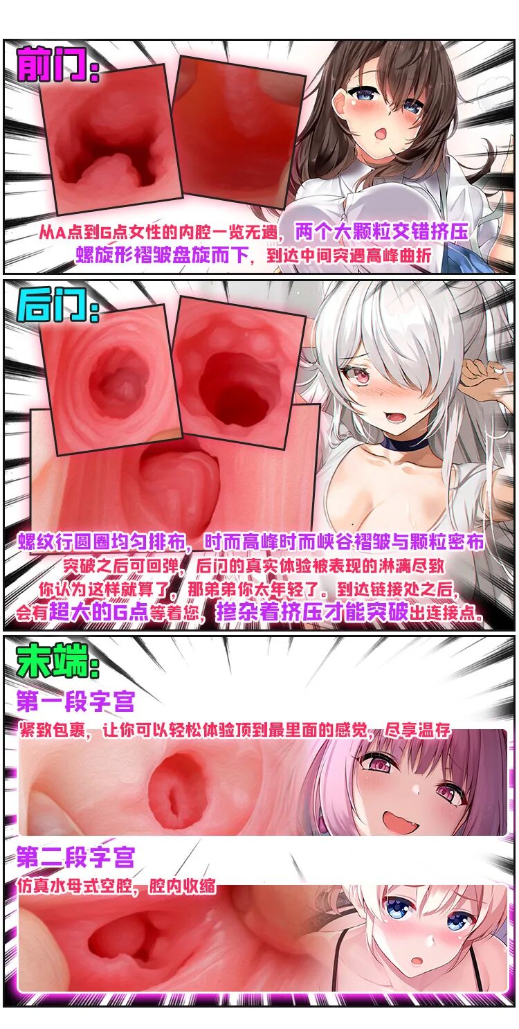 在体验方面,生徒会长的通道构造是一部分仿照真人复刻而成,另一方面添加了一些幻想的结构。让体验感及还原了真实体验,又增加了刺激度和可玩性。整体刺激度真的是非常之高,特别是突破进第一个子宫秘境,然后排气的时候,这一步的刺激感达到了巅峰。但是虽然刺激感很强,也不代表新手,就不可以体验,因为产品材质很柔软,另外通道又复刻了真实结构,即使你很敏感也不会觉得疼,只会觉得很舒适,随之而来的是扛不住这种压迫感,我们称这种刺激为软刺激。如果你能抗住生徒会长10分钟,那你真人实战40分钟基本没问题!!